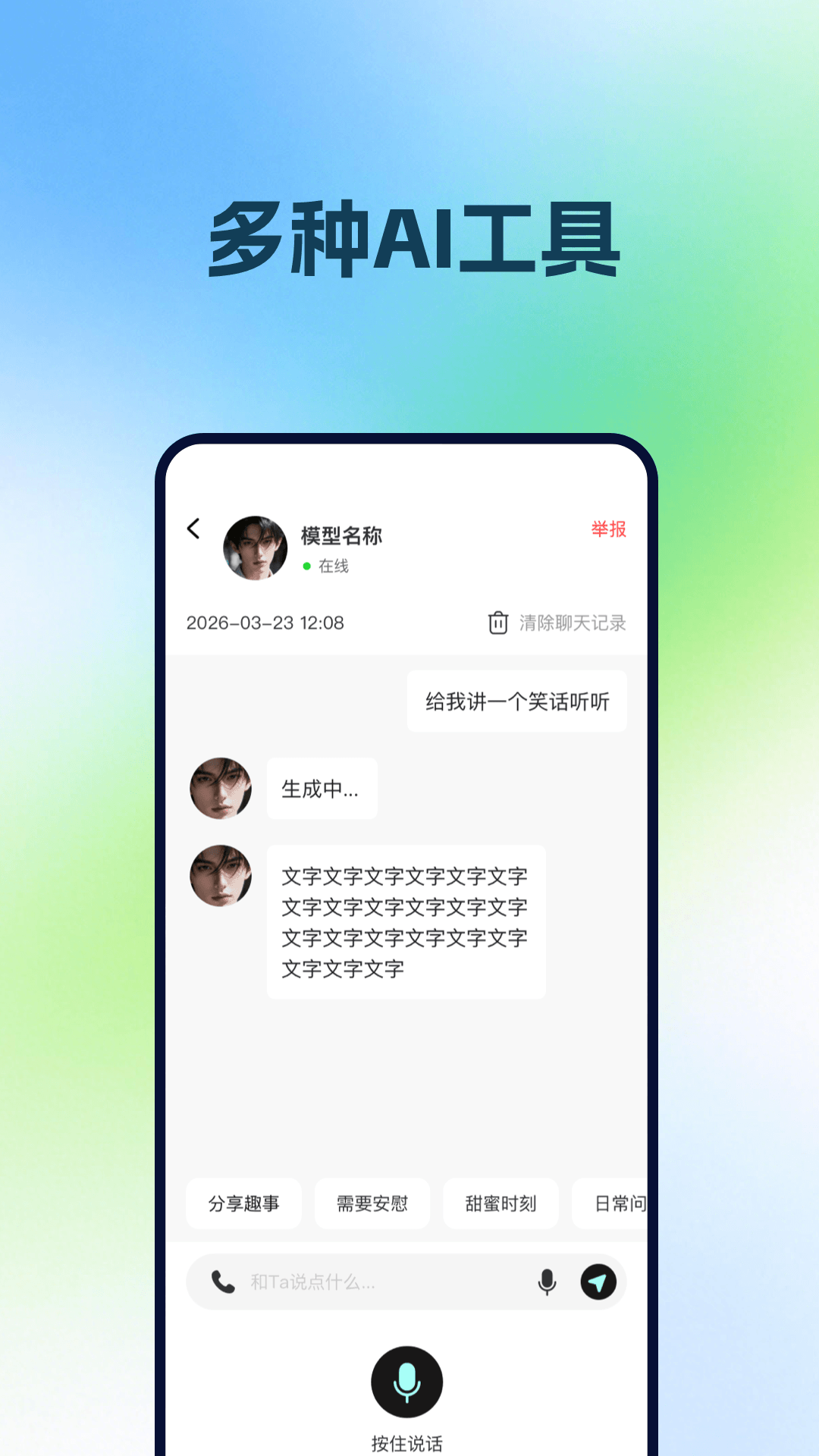 以文字对话与语音聊天为核心交互方式,满足你多样化的沟通需求。内置丰富AI 角色可选,从专业顾问到趣味伙伴,随时切换不同风格陪伴;支持自定义背景更换,打造专属视觉体验。